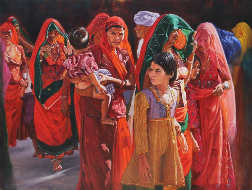 The painting is a fine example of representational art with a strong sense of realism, yet it retains a painterly quality. The brushstrokes, especially upon closer inspection, are visible and contribute to the texture and energy of the work. The artist has paid meticulous attention to detail, from the intricate patterns on the saris to the jewelry and the expressive faces of the subjects.