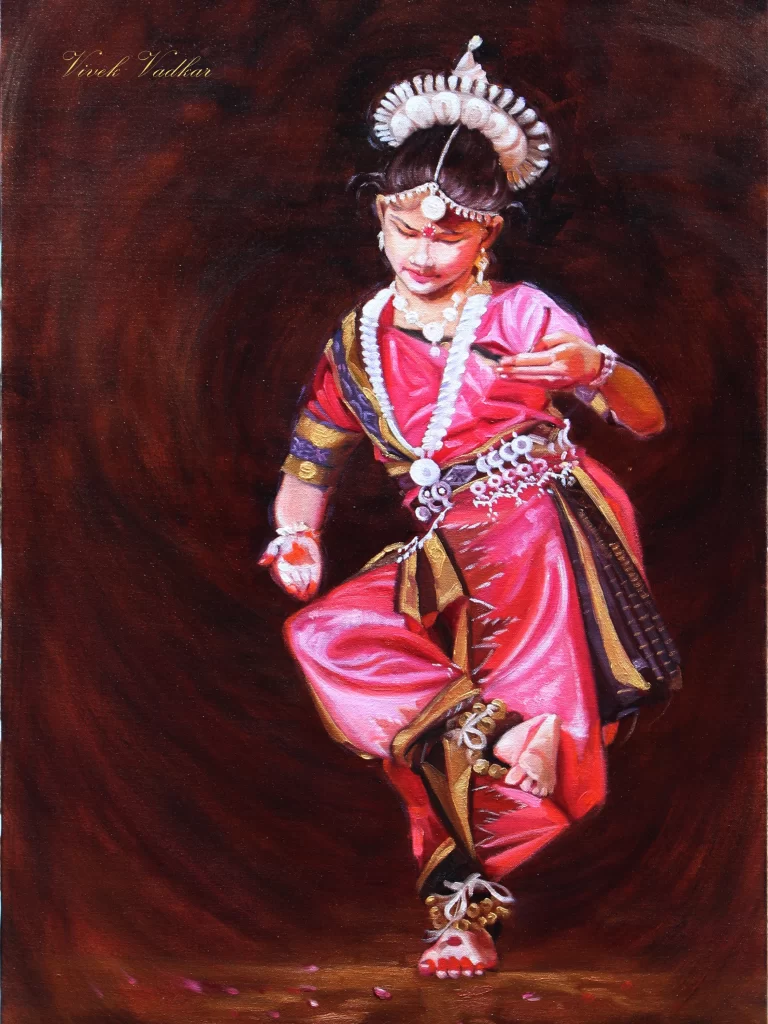 This painting, titled “Nidhi,” is an oil on canvas piece measuring 36″ x 24″. It depicts a young girl, presumably named Nidhi, in a dynamic and elegant dance pose. The artwork’s dark, rich background provides a striking contrast to the vibrant, shimmering red and gold attire of the dancer. Her expression is serene and focused, capturing a moment of pure grace and bliss. The artist’s use of light and shadow highlights the intricate details of her costume and jewelry, making the figure appear to glow from within.
